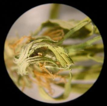 Marijuana analysis is broken out from the other drugs for our statistics. In the past, Marijuana only required a positive Chemical test and a positive Microscopic test. Now that the hemp law is in effect, marijuana can only be identified if the Delta-9 THC content is higher than 0.3%. To determine this we perform a semi-quantative analysis using the Gas Chromatograph Mass Spectrometer (more on this instrument below). The Marijuana microscopic test is still required and consists of checking for four characteristics: cystolithic hairs, glandular hairs, simple hairs and serrated edges. The image below is a marijuana sample as seen under the microscope.