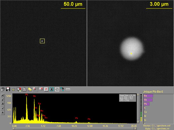 We received our Scanning Electron Microscope (SEM) in early 2003 and are now using it routinely for casework. My training included working with the supervisor of the SLED Trace Lab for several days, three days onsite training from the instrument manufacturer and countless hours of running and processing test samples. The only application for SEM work in Greenville at this time is Gunshot Residue analysis. Gunshot Residue particles are approximately 1 to 10 microns in diameter, are round and contain Lead (Pb), Barium (Ba) and Antimony (Sb). Gunshot residue is the only source for particles that contain all three of these. A micron is one millionth of a meter or one thousandth of a millimeter. That description doesn't really help most people understand how small it really is. The following link uses a penny to help you get a better idea of what a micron really is.
