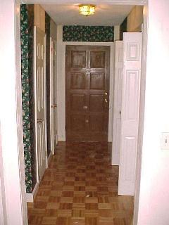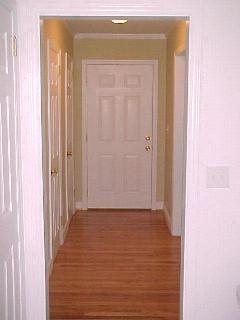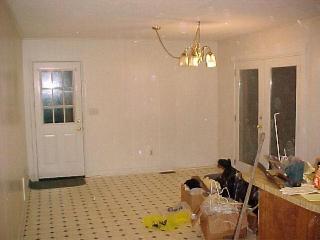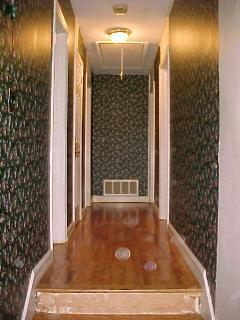 The main foryer has a new door, new light and new crown molding. The folding doors on the left leading into the living room have been taken down and the parkay floor was pulled up. The hardwood floor under the parkay had to be refinished. The wallpaper from the before image is gone now. Notice the large gaps in the wallpaper around and above the doors. The wallpaper was a floral patten and some of the pieces were upside down.