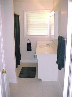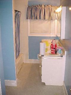 These images show the new tile floor, counter top and sink in the bathroom. The tile runners was replaced with floor molding. The bathroom now has a smooth ceiling.