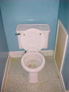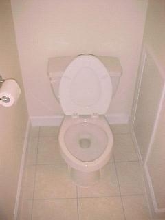 The toilet was replaced with one that wasn't cracked and leaking. It's hard to see it in this image but the tile runners on the left and the front right are two different designs in the before picture.